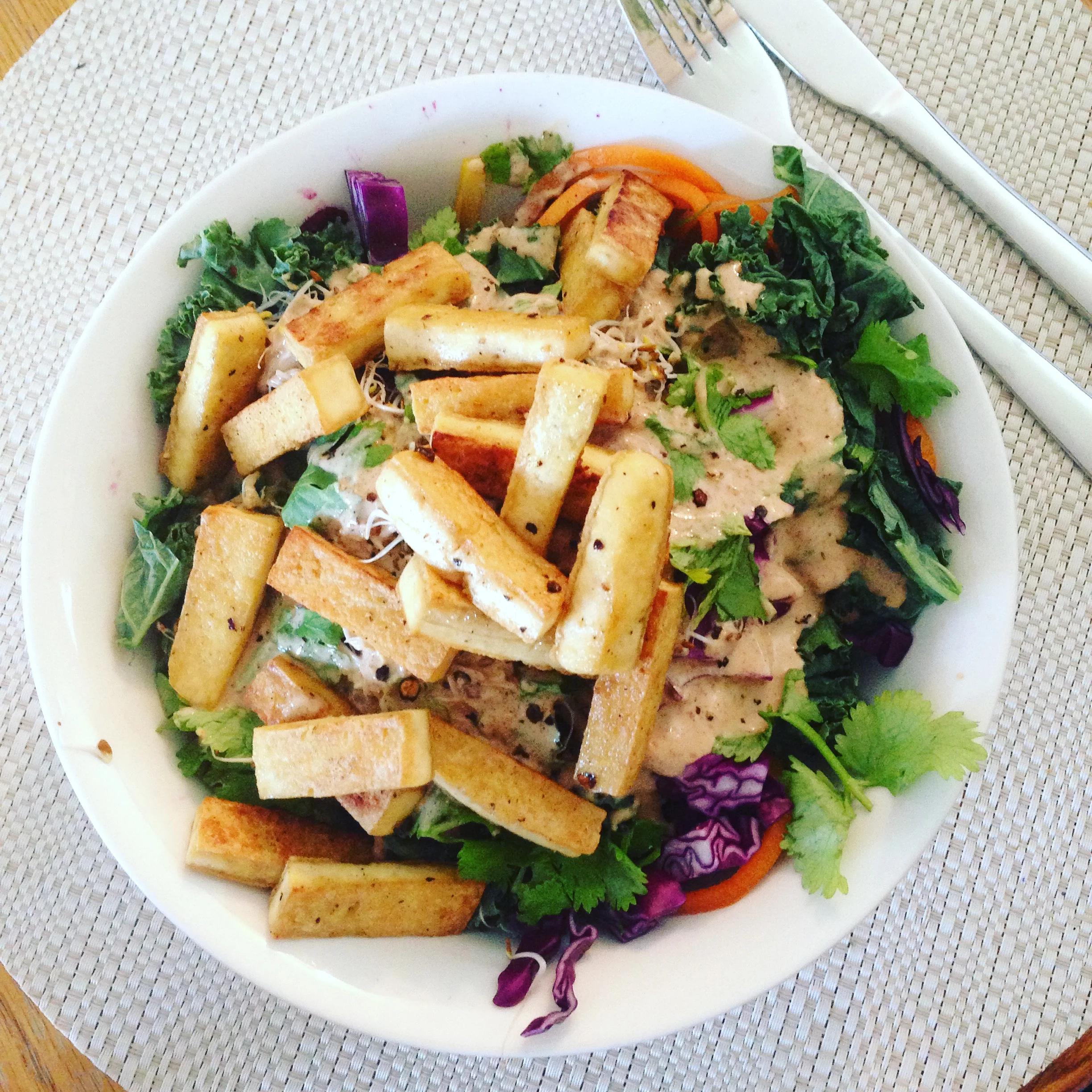 Why not throw a variety of veggies you have in your fridge in a pan (I like cauliflower, purple cabbage, zucchini, carrots, kale), or get out your spirilizer (great for carrots, zucchini, and beets), and top with this delicious asian peanut sauce. Ta-da, it's a buddha bowl!