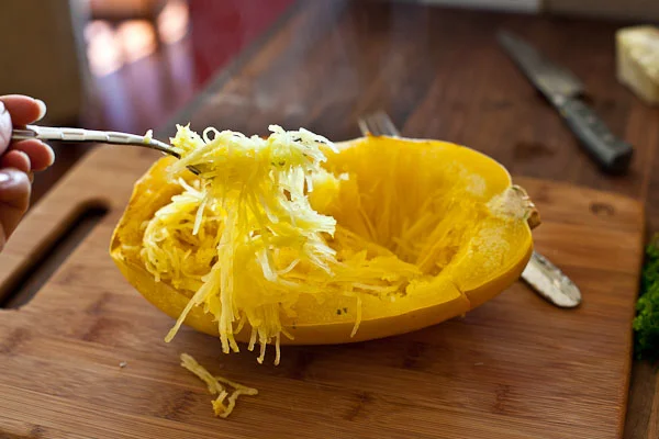 • Once cooked, remove the squash from the oven, turn cut side up and shred the squash into spaghetti-like strands with a fork; season with salt and pepper.